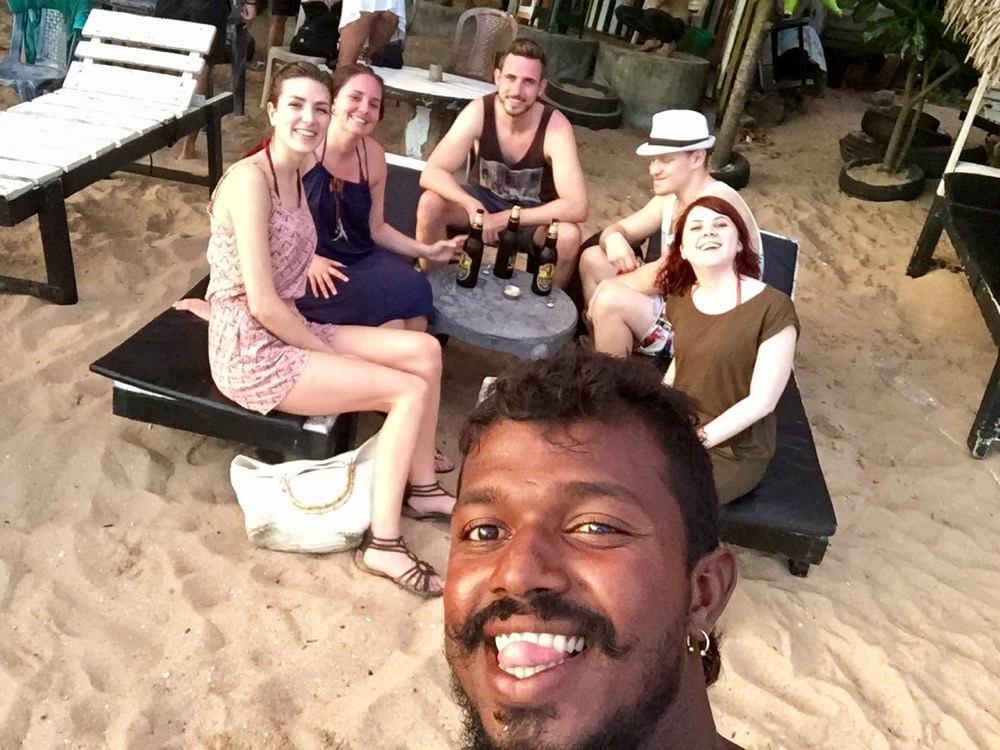 Später gerieten wir wieder in “die Fänge” von Bobby, der Lena, Steffen, mir und zwei weiteren Studenten Bier bzw. Ingwertee brachte. So saßen wir noch gemütlich beisammen und unterhielten uns, mit Bobby handelten wir einen echt guten Preis für Surfstunden aus, wenn wir das nächste Mal an den “Sahana Beach” kommen werden. Ich als Sportskanone freue mich da schon besonders drauf. 😉 Da es bereits dunkel war (18:30 Uhr geht hier die Sonne unter) und wohl keine Busse mehr fuhren, entschieden wir uns wieder für eine Fahrt mit dem Tuk-Tuk. Unsere Unterkunft scheint allerdings so weit abgelegen zu sein, dass niemand die Adresse kennt. Der Fahrer wandte sich kurzerhand an Bobby, der erfreut ausrief, er kenne diese Adresse, denn da habe er erst letzen Freitag “some other german guys” hin gebracht. Kurzerhand saßen wir nun zu viert auf der engen Rückbank, ich auf Lenas Schoß, und Bobby wies dem Fahrer den Weg. Wir hatten zuvor 200 Rupien ausgehandelt, es stellte sich jedoch heraus, dass die Strecke länger war als vermutet und der Fahrer amüsierte sich während der Fahrt in die “Pampa” prächtig über dieses wohl doch etwas unverschämte Angebot. Am Ende kamen wir gut an und hatten dabei jede Menge Spaß, dem armen Fahrer gaben wir dann doch das Doppelte. 😉