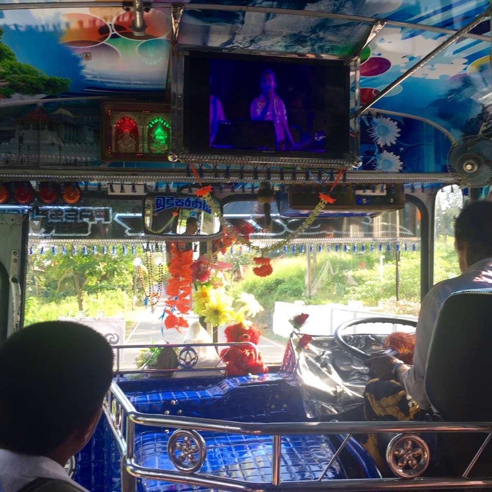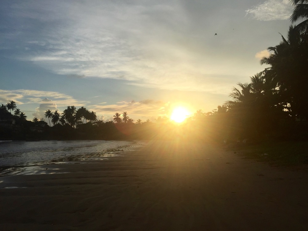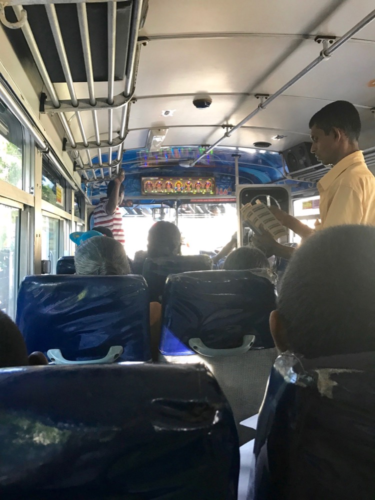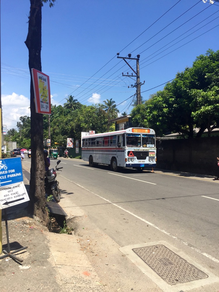 Am späten Nachmittag wollten wir an den “Sahana Beach”, an dem auch einige andere Studenten sein wollten. Mit dem Bus ging es zunächst ins Zentrum von Galle. Die Fahrt dorthin allein war schon ein Erlebnis, denn der Bus war kribbelbunt bemalt und geschmückt (unter anderem mit Blumenketten und einer Buddha-Statue) und auf einem großen Bildschirm tief doch tatsächlich das Konzert, was uns schon auf der Fahrt vom Flughafen beglücken durfte. Gehupt wurde wieder was das Zeug hielt. Zudem wurde man vor allem von kleinen Kindern angestarrt, die einen unverhohlen musterten. In Galle mussten wir schließlich umsteigen, hierbei verloren wir für einen Moment Lena aus den Augen, denn der Bus fuhr einfach weiter, bevor sie aussteigen konnte. Ein paar Meter weiter hielt er dann jedoch erneut, sodass wir schnell wieder beisammen waren. Generell springen die Menschen hier oft während der Fahrt noch schnell auf oder schon ab. Mit dem nächsten Bus ging es dann zum Strand. Die Einheimischen sind sehr hilfsbereit und freundlich, manchmal muss man jedoch aufpassen, dass man nicht über den Tisch gezogen wird.