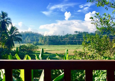 Am Guesthouse begrüßte uns Menik freudig und bereitete uns eine kleine Mahlzeit vor, die mir natürlich viel zu scharf war, Lena war natürlich begeistert. Mit uns im Guesthouse wohnen noch zwei Engländer, welche ebenfalls im Krankenhaus arbeiten (schon seit 6 Wochen) und Steffen, ein Deutscher aus Rostock, welcher mit uns das PJ-Tertial beginnt. So machten wir uns nach einem Frühstück mit wunderschöner Aussicht (s. Fotos) am nächsten Morgen auf den Weg zum Krankenhaus. Dieser führte uns vorbei an allerlei Pflanzen und einheimischen Behausungen, denn unser Guesthouse liegt etwas in der (sehr idyllischen) “Pampa”. An der Hauptstraße angekommen, nahmen wir den nächsten Bus zum Krankenhaus. Als wir meinten es gefunden zu haben, stiegen wir aus und machten uns auf den Weg hinein. Ich war erstaunt wie modern und gut die Verhältnisse in dem Gebäude waren, hatte ich es mir doch anders vorgestellt und die Bilder von Google auch anders in Erinnerung. Als wir uns schließlich am Tresen mit “we are medical students” vorstellten, belächelte uns die Dame nur und gab zu verstehen, dass es sich um ein privates Krankenhaus handele, unseres sei eine Straße weiter. So erklärten sich auch die relativ guten Verhältnisse dort. Der richtige Ort, an den wir mussten, war dann schnell gefunden, denn vor der Fakultät hatte sich eine große Masse an weißhäutigen ungebräunten Menschen in unserem Alter versammelt. Hier waren wir richtig.