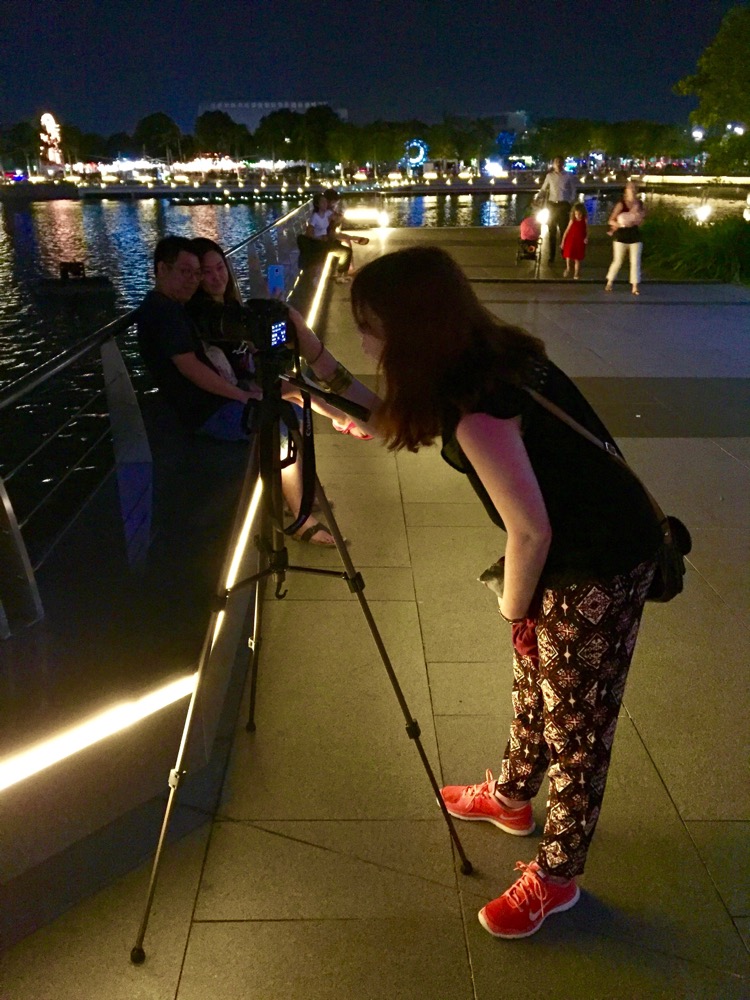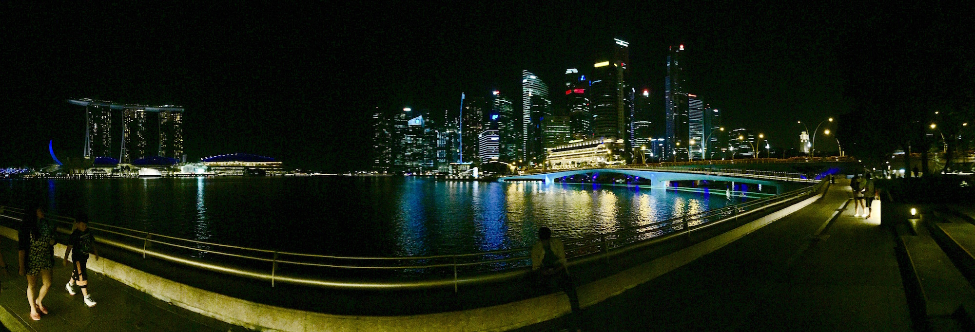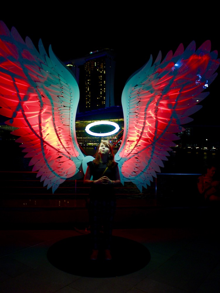 Da wir nun noch eine Dreiviertelstunde Zeit hatten, setzten wir gleich mal unsere im Fotokurs erworbenen Kenntnisse um. 😉 Rund um die Marina Bay gab es verschiedene Lichtinstallationen zu bestaunen. Nach der Lasershow wollte ich gerne noch zum berühmten Riesenrad Singapurs, dem Singapore Flyer. Dafür mussten wir einmal komplett um die Marina Bay herumlaufen.