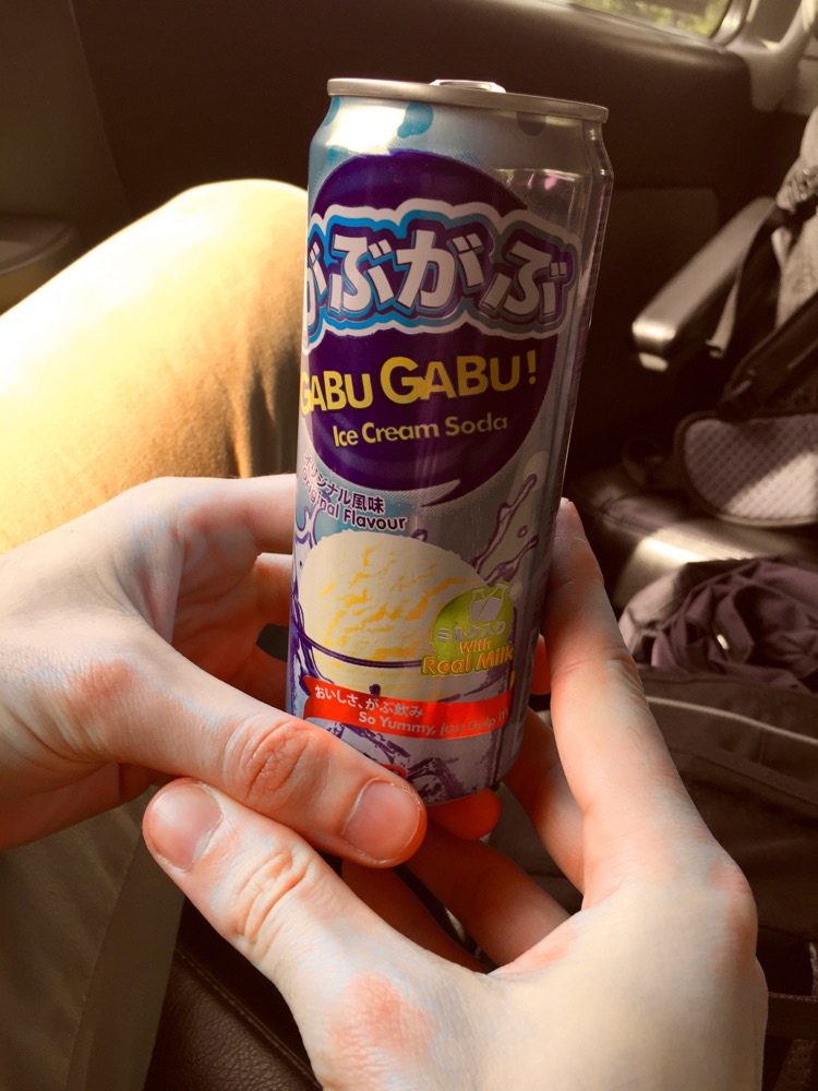 Nachdem wir unseren Fahrer, der uns zum Schiff bringen sollte, relativ schnell gefunden hatten und klar wurde, dass ein mitreisendes Paar aufgrund eines verspäteten Fluges nicht mehr kommen würde, stiegen wir mit zwei weiteren Mitfahrenden in das Auto. Auf dem Weg zum Schiff wurden wir vom Fahrer mit eisgekühlten Dosengetränken aus Japan versorgt: Ice Cream Soda. Es schmeckte genauso, wie es hieß, nämlich nach flüssigem Vanilleeis, also relativ eklig. Der Fahrer fand es lustig und ließ uns raten, wie viel so eine Dose wohl kosten würde und nach viel Hin und Her fanden wir den Preis dann heraus: 50 ct. An Ratespielen hatte er so seinen Spaß: Als nächstes wollte er von uns wissen, wie alt wir ihn schätzen würden. Jedes von uns genannte Alter wurde mit einem empörten „Noooo!“ von ihm quittiert. So verging die Fahrt auch einigermaßen schnell. 😉