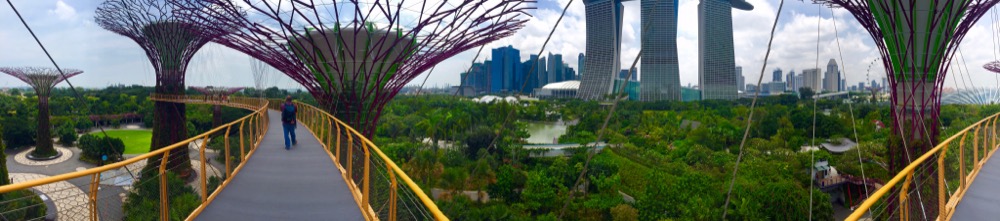 In der künstlich geschaffenen riesigen Grünanlage gibt es in zwei großen Gewächshäusern zahlreiche Pflanzen aus aller Welt zu bestaunen. Zudem befinden sich hier die „Super Trees“, Bäumen nachempfundene Stahlkonstruktionen, die statt Sauerstoff teilweise den Strom für ihre eigene Beleuchtung produzieren. Hier konnten wir echte „Skywalker“ sein: Von der sich zwischen zwei „Bäumen“ befindenden Brücke („Skywalk“) hatten wir eine tolle Aussicht auf die im Hafen liegende „Mein Schiff“ und die Stadt mit dem berühmten Marina Bay Sands Hotel.