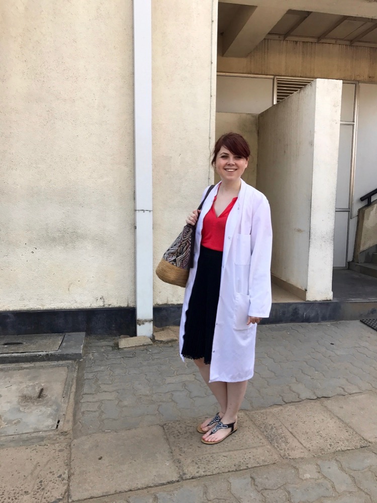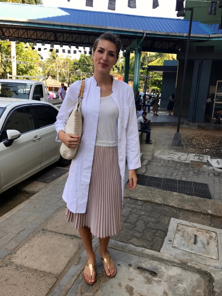 Uns sprang vor allem die hübsche Schwesternkleidung bestehend aus blaugestreiftem Kleid mit weißer Schürze und weißen Hauben, welche an frühere Jahrhunderte erinnerte, ins Auge. Doch sind die meisten Schwestern hier eher fotoscheu, weshalb wir euch leider kein Bild davon zeigen können. Auch die Ärzte und Ärztinnen erscheinen stets gut gekleidet in Anzug und Kleid oder Rock zur Arbeit, sodass wir uns ihrem Kleidungsstil anpassten (siehe Fotos). Kittel und Stationskleidung, wie bei uns üblich, sucht man hier vergebens. Die einzigen, die hier Kittel tragen müssen, sind die ausländischen Studenten, damit wir auch als solche erkannt werden (ihr wisst ja: Touristen und so. ;)).