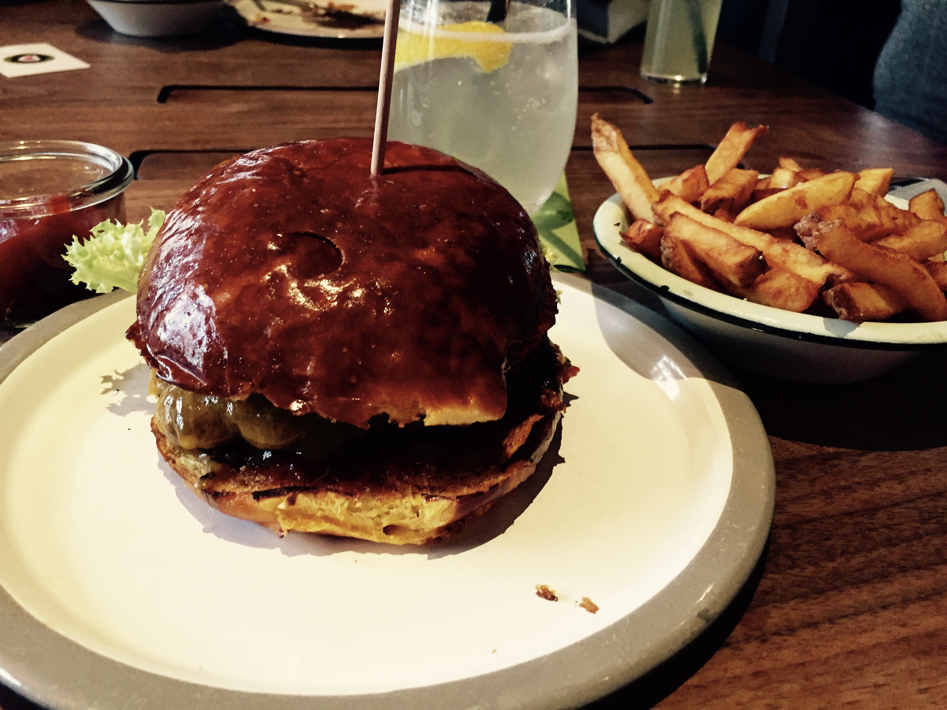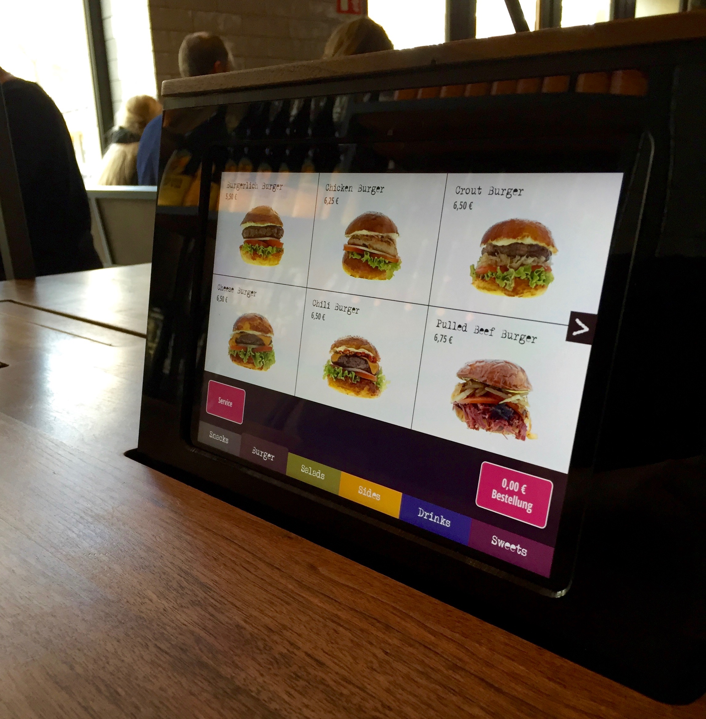 Trotz des reichhaltigen Frühstücksbuffets knurrte uns nach einiger Zeit der Magen und wir gingen dieses Mal – ja richtig geraten – Burger essen! Im „Burgerlich“ konnte man seine Bestellung ganz modern direkt via iPad, welches bei Druck aus dem Tisch herausfuhr, aufgeben.