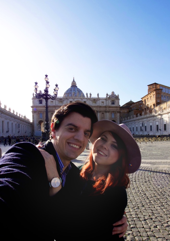 Für den nächsten Tag hatten wir uns vorgenommen, den Besucherschlangen am Petersdom zuvorzukommen und machten uns deshalb gleich nach einem frühen Frühstück auf den Weg zum Vatikan. Dies hatte sich gelohnt, nach nicht einmal 5 Minuten Anstehen waren wir durch die Sicherheitskontrollen und unterwegs in Richtung “ascensore”, mit dem wir in die Kuppel des Domes fuhren. Die letzten Höhenmeter mussten wir jedoch zu Fuß verrichten, was recht abenteuerlich erschien, denn die letzten Stufen waren so schmal und eng, dass anstatt eines Geländers nur ein dickes Seil zum Festhalten in der Mitte der Wendeltreppe vorhanden war. Zudem waren Alexanders Füße etwas zu groß für die schmalen Stufen. Oben angekommen wurden wir mit einer wunderbaren Aussicht auf den Petersplatz und die Stadt belohnt.